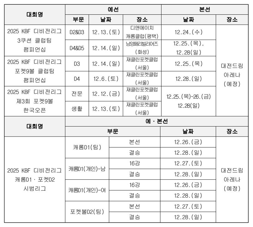 2025년 KBF 디비전리그와 대한당구연맹의 한 해를 마무리 짓는 시즌 마지막 이벤트!